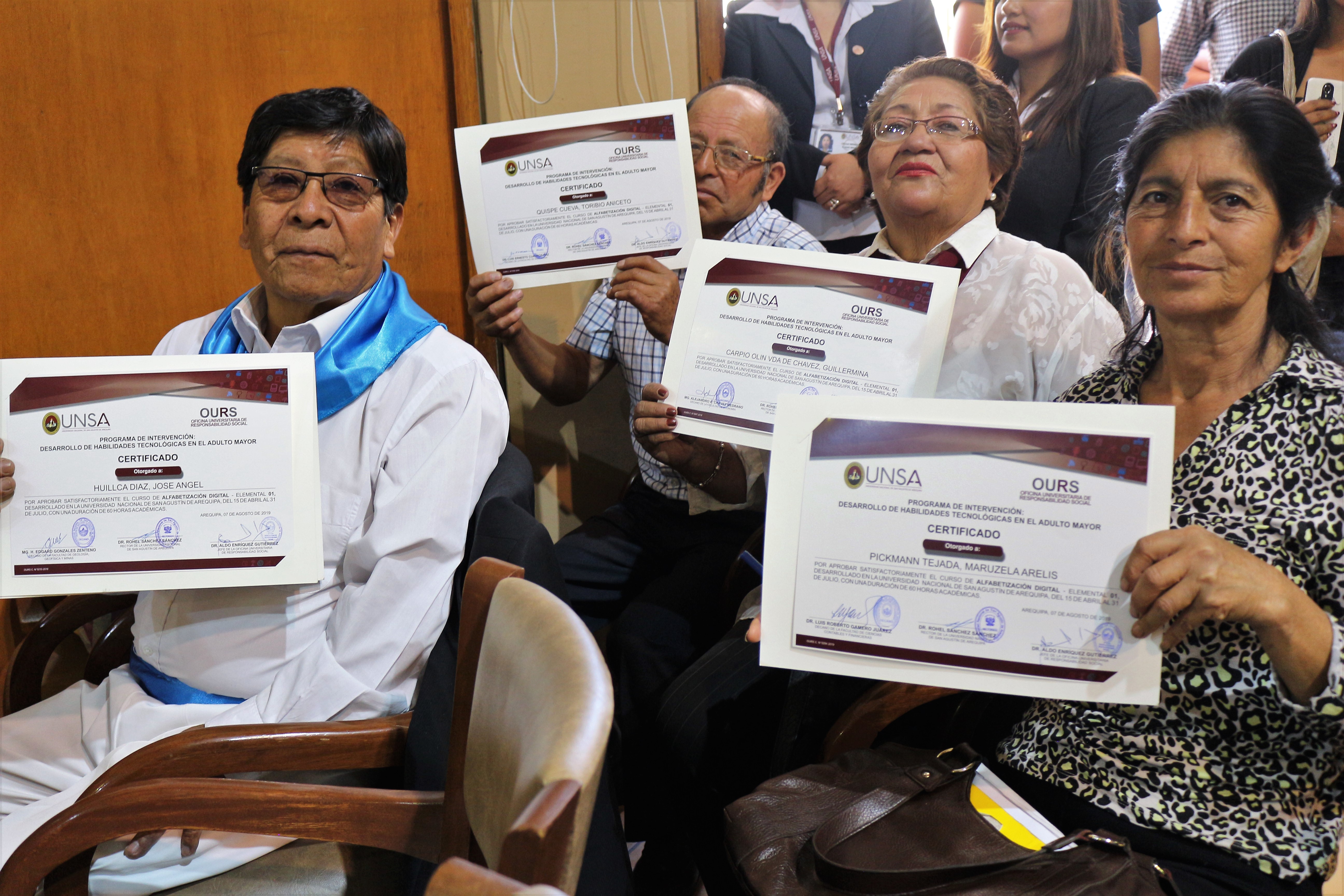 Durante la ceremonia de clausura del Programa de Desarrollo de Habilidades Tecnológicas del Adulto Mayor que promueve la Oficina Universitaria de Responsabilidad Social de la UNSA, la representante del MINEDU, reconoció el trabajo que se realiza al educar a más de 1700 adultos mayores de manera gratuita.